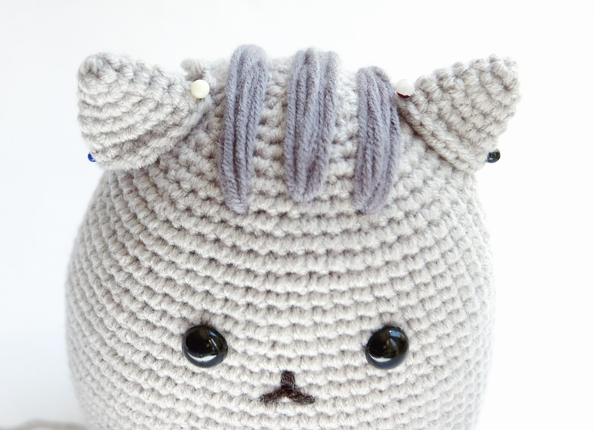 Stuff the tail, spread out the filling evenly, it helps to go in from the outside with a yarn needle. Bend the tail slightly so it wraps around the body of Pusheen.